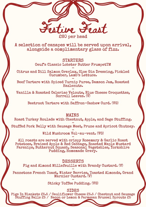 Expect a three-course Festive Feast, canapés, and a complimentary glass of fizz on arrival. It’s all the sparkle and flavour of Christmas, Oeuf style!